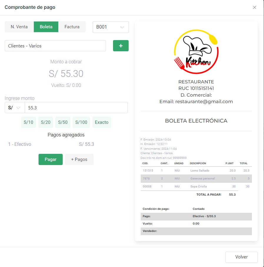 Una vez que el pedido esta listo, seleccionar la opción de Finalizar Venta, el sistema presenta un menú que permite al usuario elegir el tipo de comprobante (boleta, factura, nota de venta) y asignar el cliente correspondiente. También se puede seleccionar la serie del comprobante, garantizando que el proceso de facturación cumpla con los requisitos de numeración y emisión establecidos.